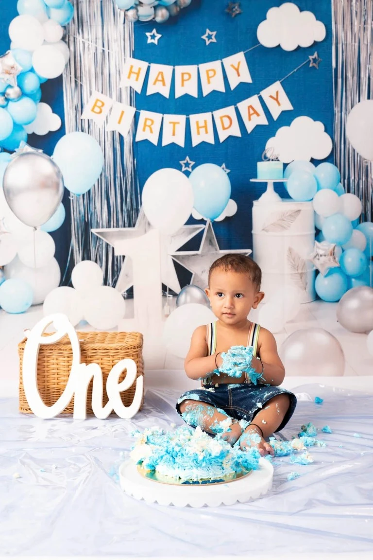 Special birthday packages available with themed setups, decorations, balloons, and cake smash opportunities for memorable first birthday celebrations.